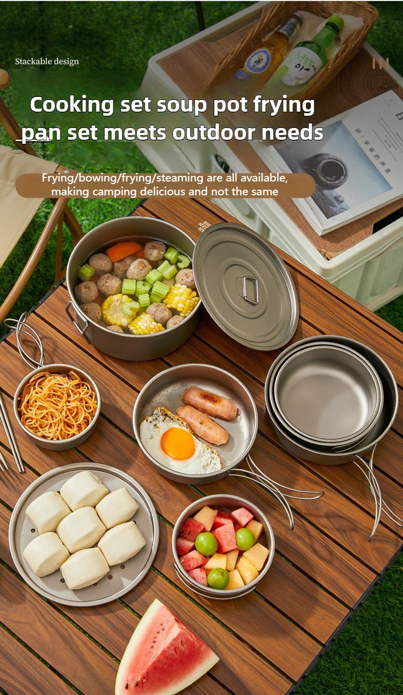 3-piece titanium set: 750ml pot, 450ml cup, and foldable spork. Ultralight at 5.5 oz total. Non-reactive and easy to clean. Mesh storage bag included.